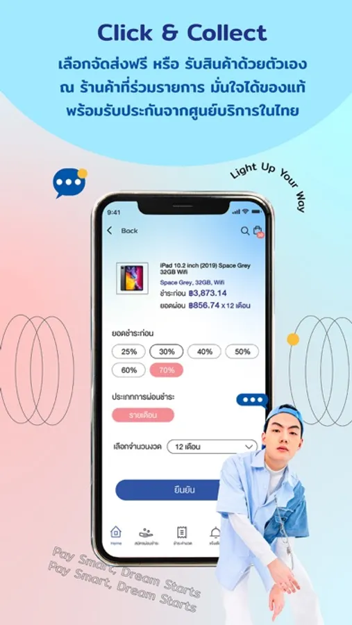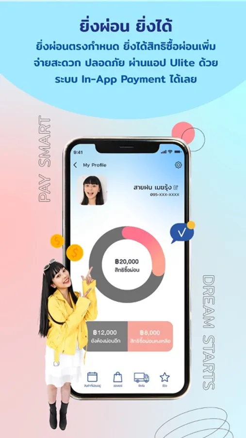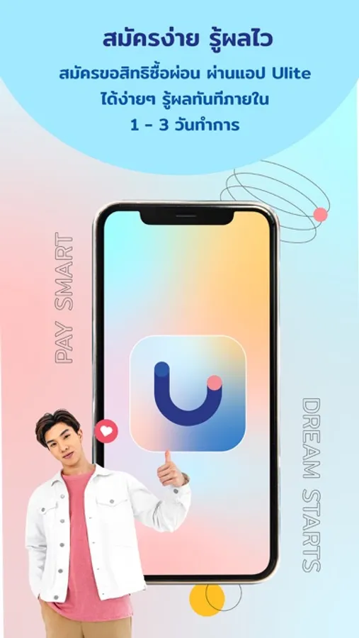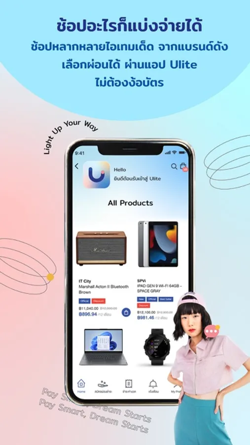 ดาวน์โหลดแอป Ulite แล้วช้อปเลย! จะจ่ายเต็มหรือแบ่งจ่ายก็ง่าย ตอบโจทย์ด้วยโซลูชั่นในการผ่อนยาวนานถึง 12 เดือน เพิ่มความสะดวกสบายในการช้อปโดยคุณสามารถเลือกโปรแกรมการผ่อนและยอดจ่ายก่อนอย่างอิสระภายในแอป