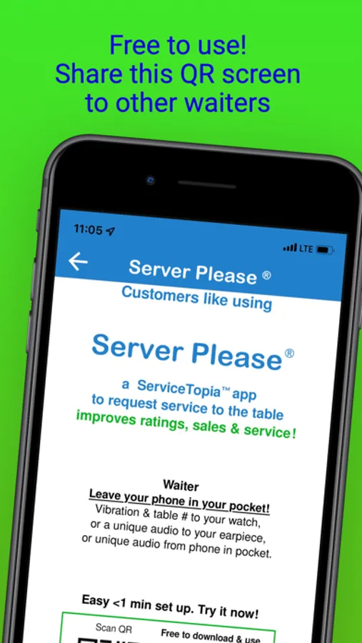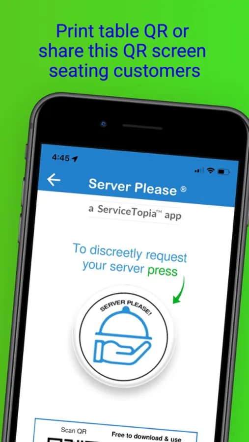 Customer can still use eye contact & hand gestures. ButIf they get impatient: scan QR code, enter table number (on QR code), & press the button! Quick Simple! They hit a button instead of asking for the bill!