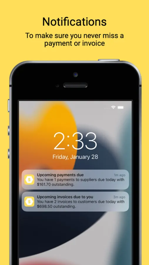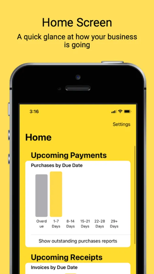 - Simple Home Screen giving you an immediate snapshot of the current state of your business including upcoming due dates for outstanding sales and purchases