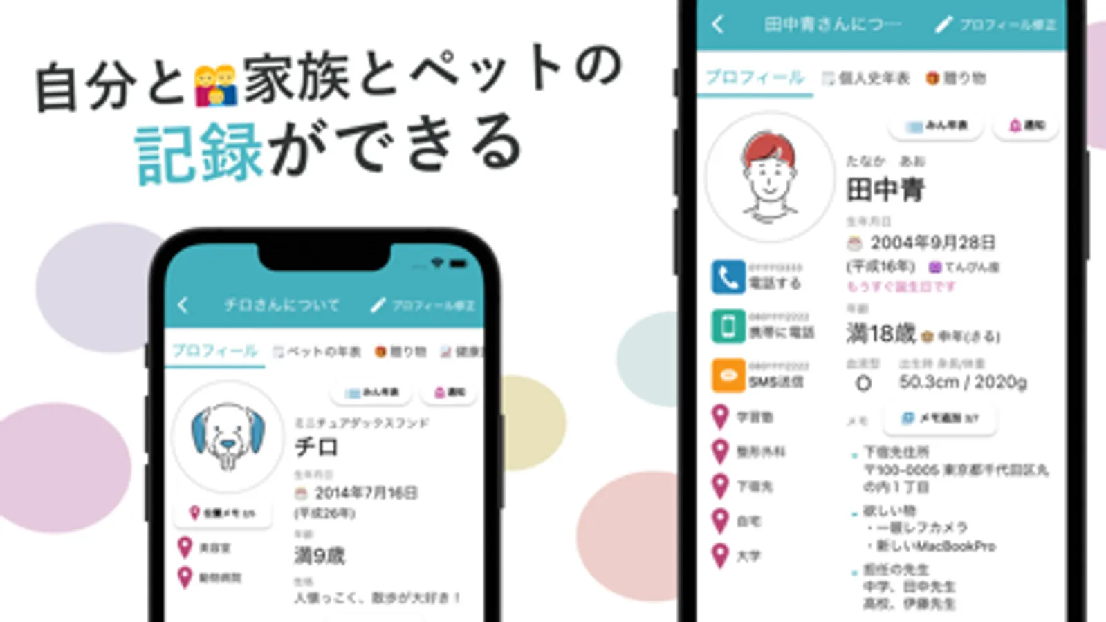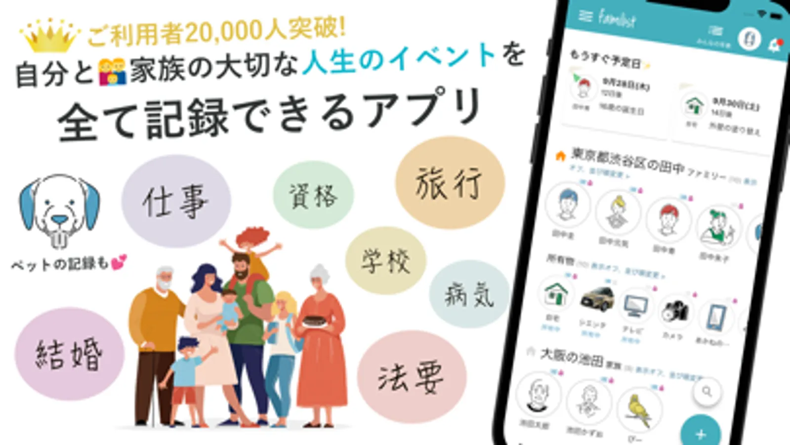 →家族単位で整理でき、シンプルで分かりやすい表示にしています。家族の一員のペットも入力出来ます。