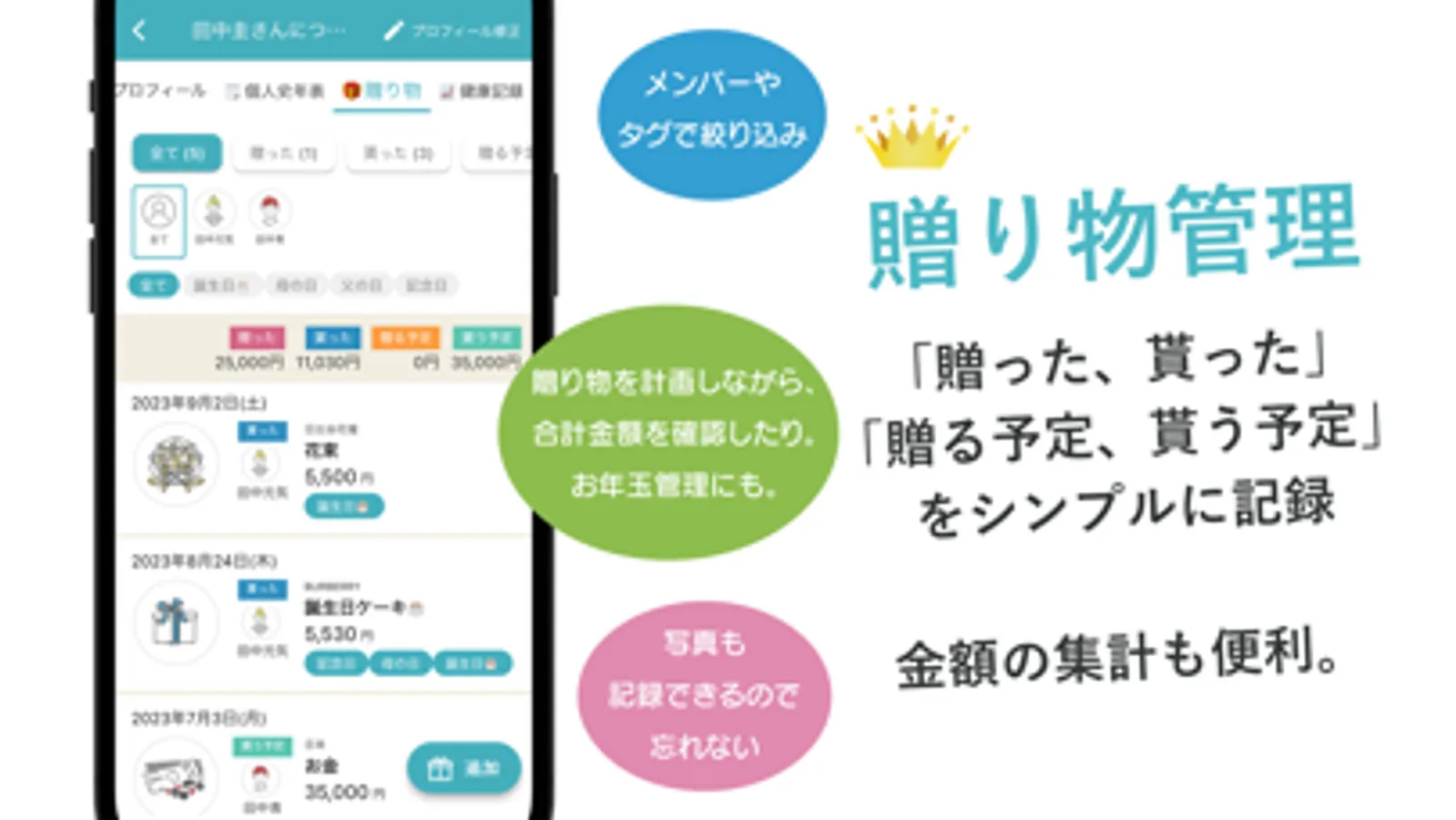 →家族や親戚や友人との「贈った」「頂いた」「贈る予定」「貰う予定」を記録出来ます。登録メンバーを贈り物相手に指定すると、そのメンバーの贈り物リストにも表示されます。贈り物のやり取りを記録して、大切な人との絆を深めましょう。