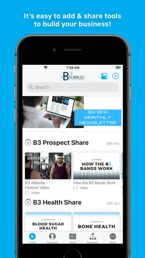 With the B3 Share app, you can easily share your way to success with tools that create word-of-mouth buzz and complement belly-to-belly efforts! Connect with new contacts and interact with your team by sharing exclusive, corporate-approved tools. You’ll have a vast array of marketing materials like videos, images, and more—all right at your fingertips! The powerful, yet beautifully simple design, along with compelling tools, makes growing your business simpler than ever.