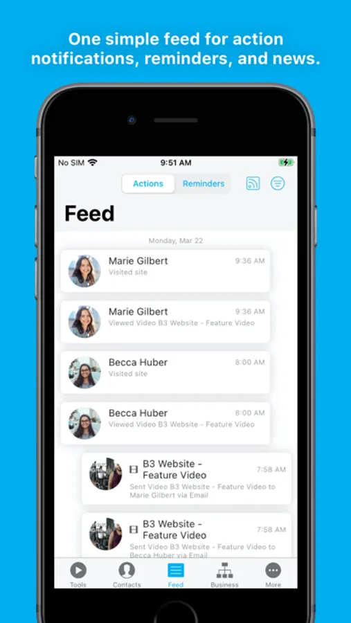 Contacts: Choose how to sync and manage your contacts. Swipe to sort them by interest level. You can make connections, add notes, or check out the Contact Feed to see the tools you’ve shared and contact actions.
