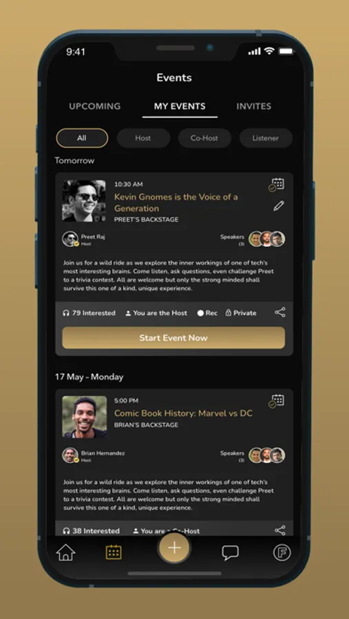 Schedule your future live events. Invite co-hosts and guest speakers, create buzz and build your community by sharing links and get direct access to people interested in your content.