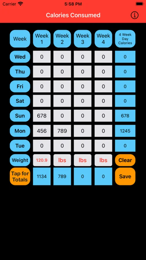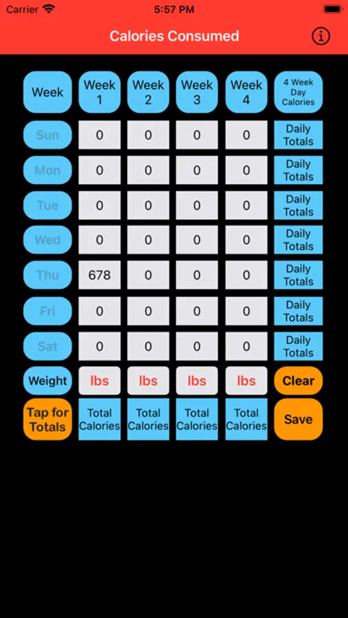 If you count your calories on a daily basis, this app will help you keep up to 1 month of calories at a time. You can also add in your weight in the "lbs" label for each week.