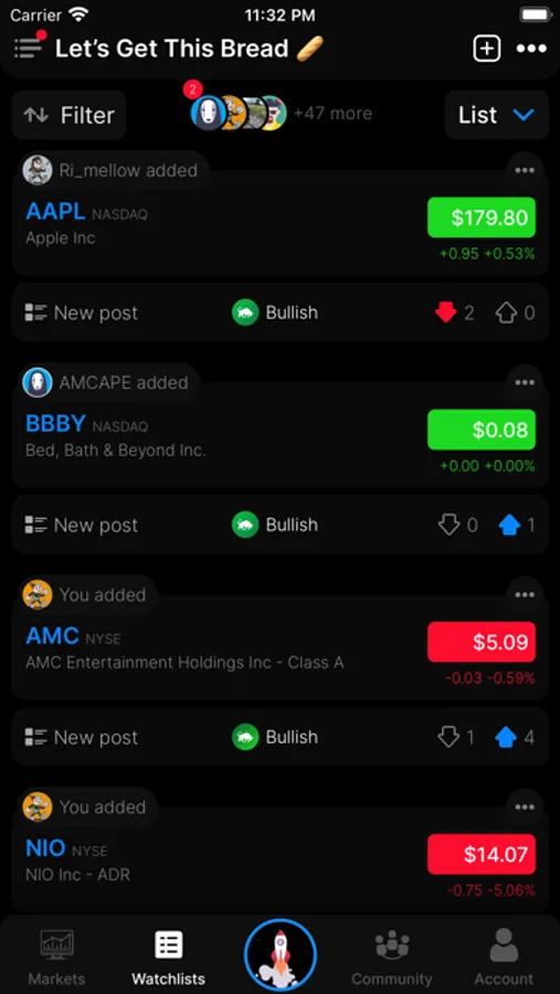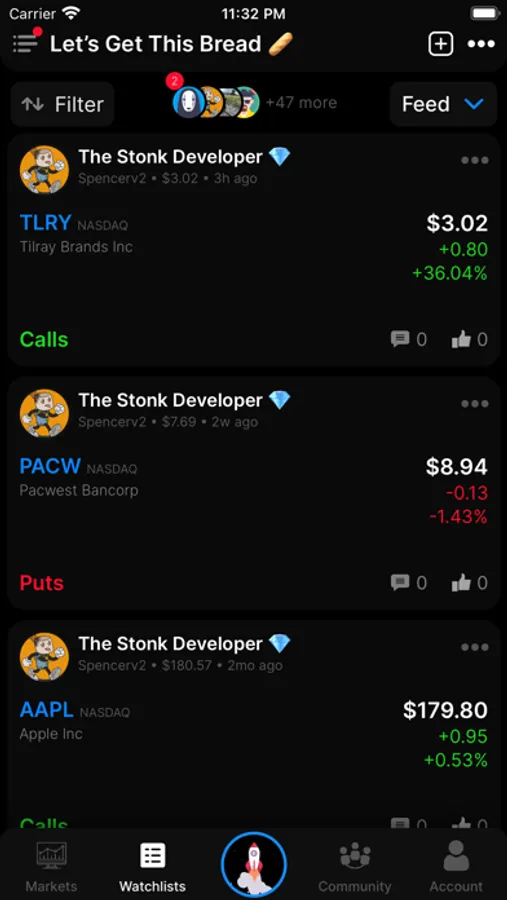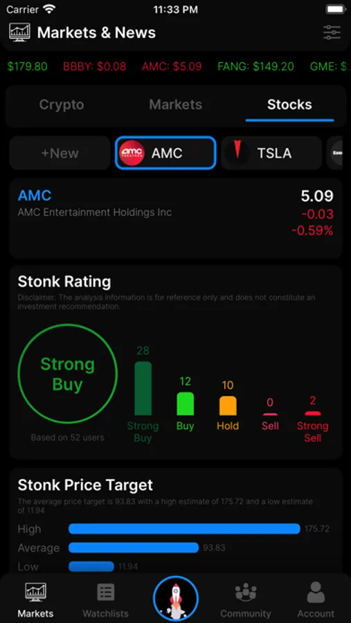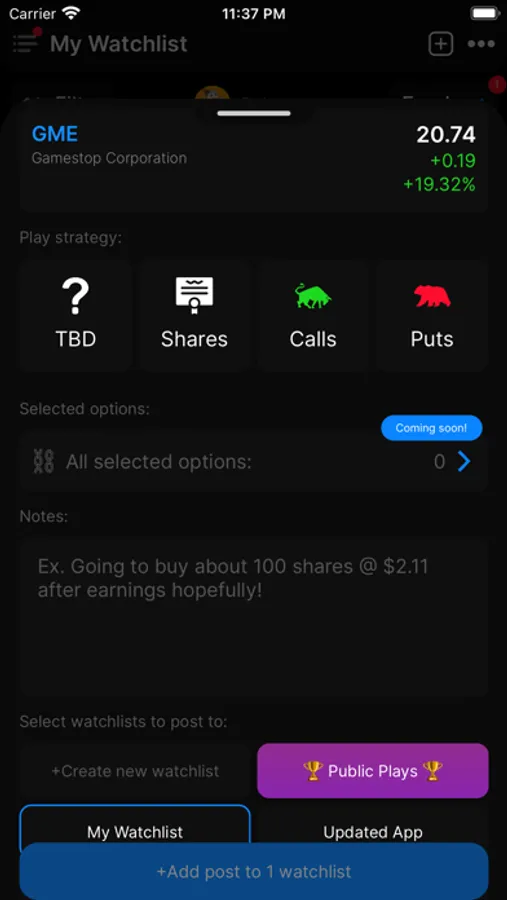 With Stonk you are able to create watchlists with your friends that actually want to hear about all your stock plays, but we didn't stop there. We added a full stock page to view chart data, stock comments, options, stock analysis/price target, and more! You can look at all the stock data before adding it to your watchlist instead of jumping back and forth between apps.