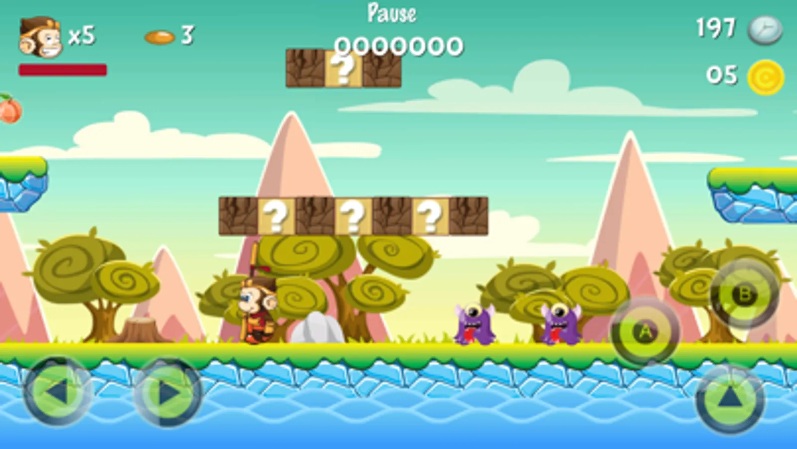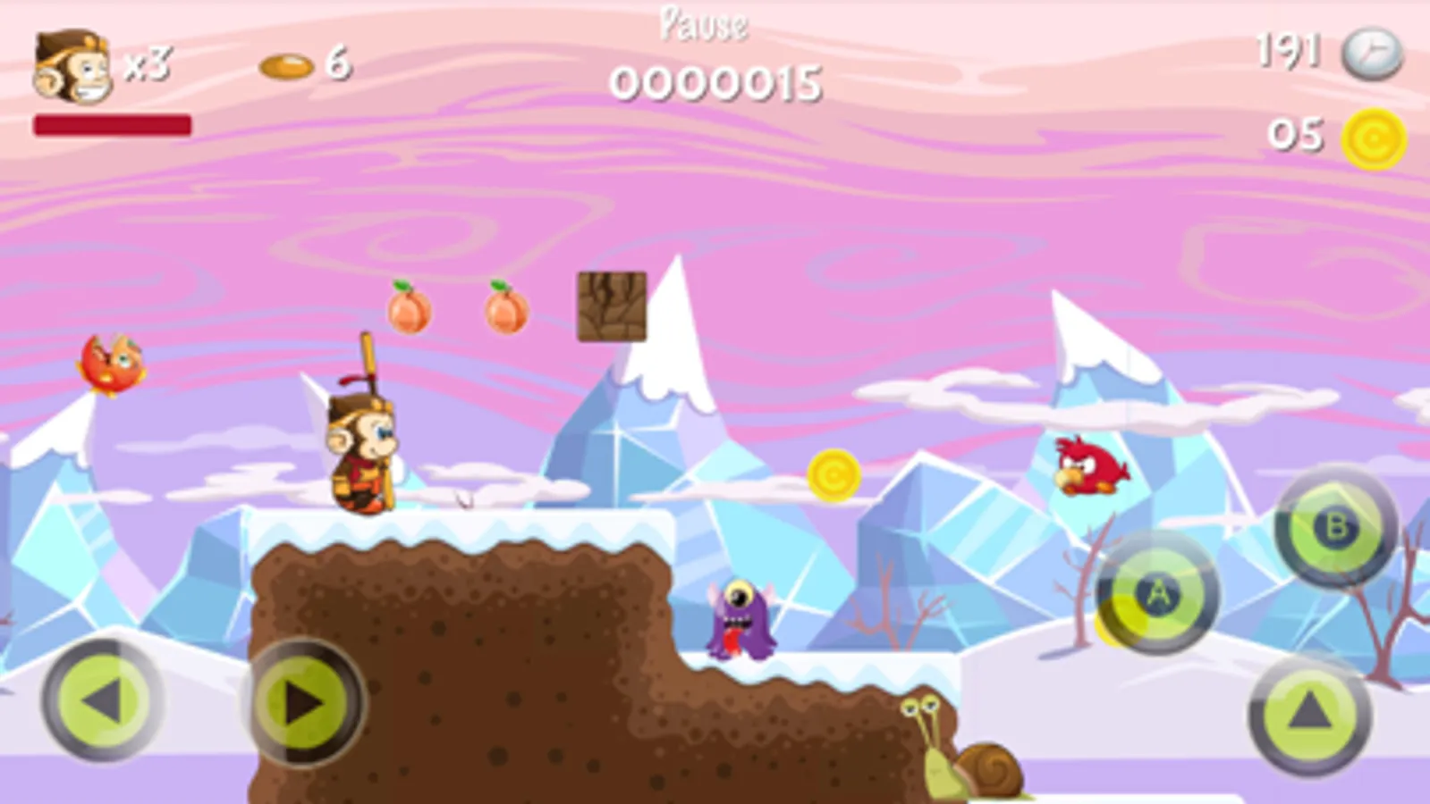 - Break the bricks to get bananas, peaches, and coins