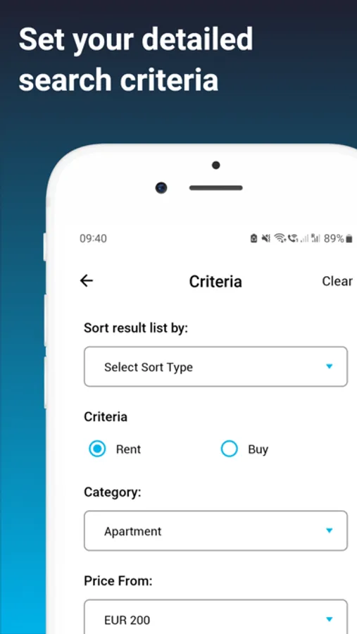 − Select properties according to criteria such as the location, type of property (house, apartment, parking etc.), rental price or number of rooms.