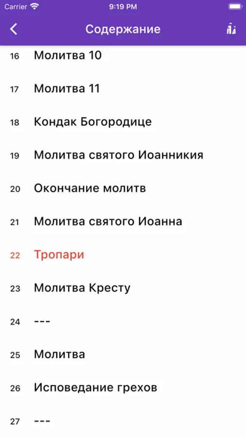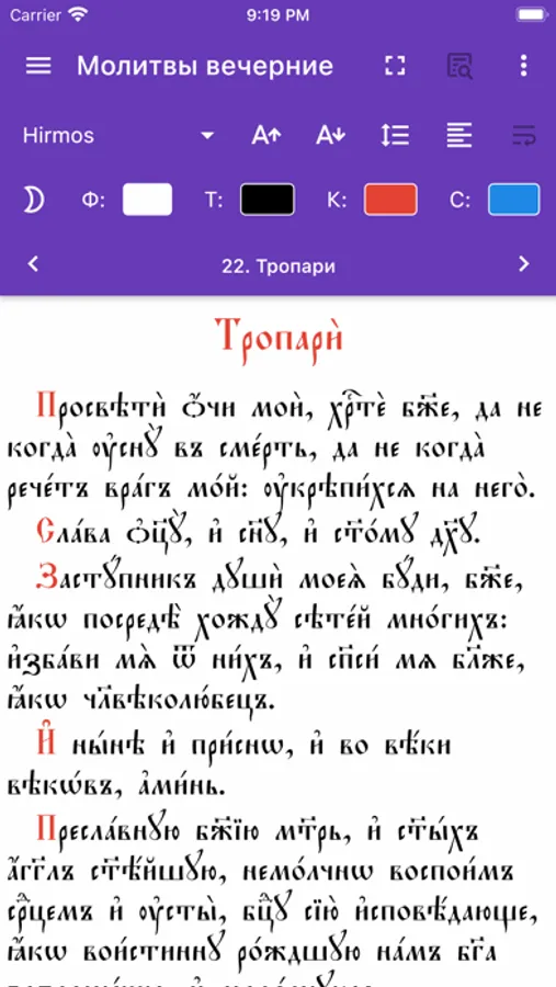 Приложение позволяет просматривать тексты различных книг на церковно-славянском языке. Книги загружаются с удаленного сервера и сохраняются на устройстве для последующего чтения в режиме "оффлайн".