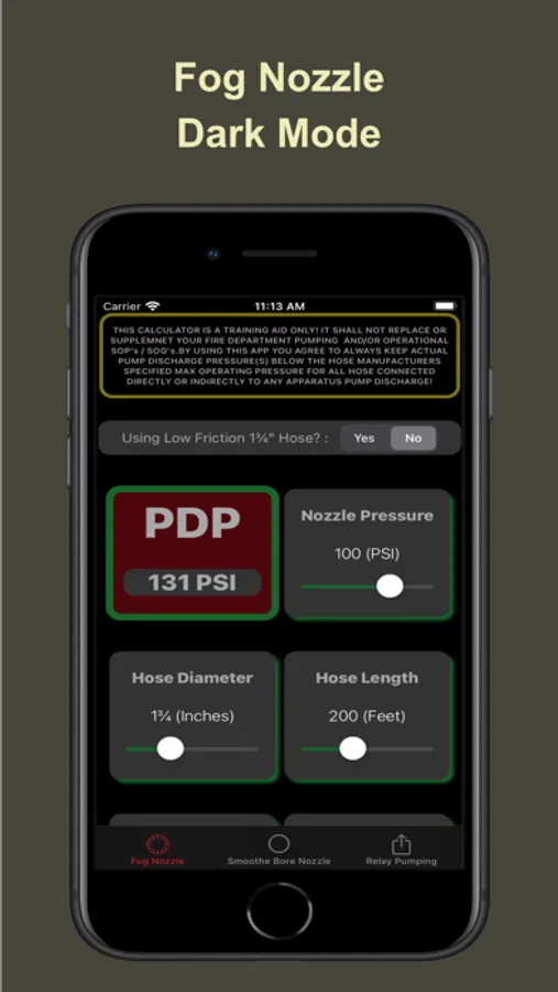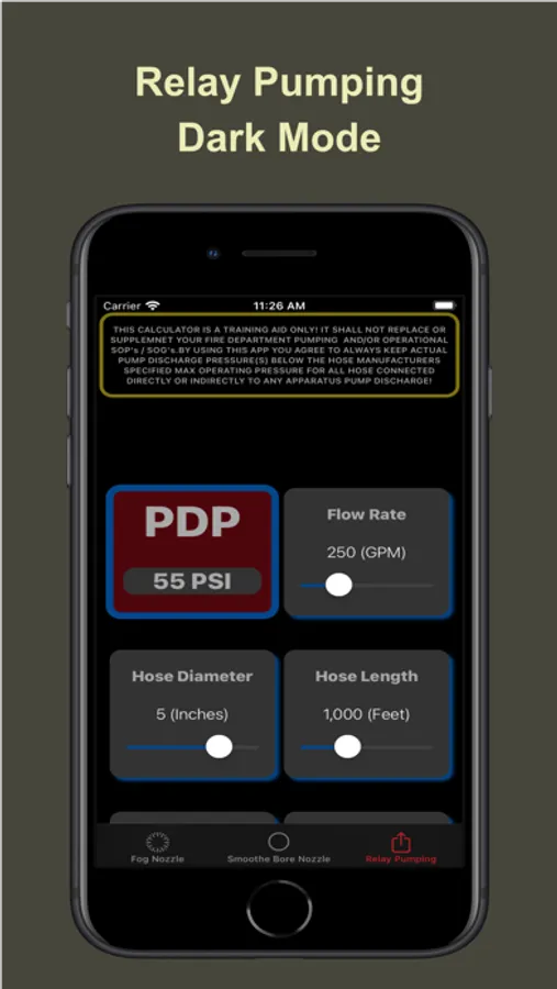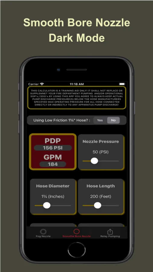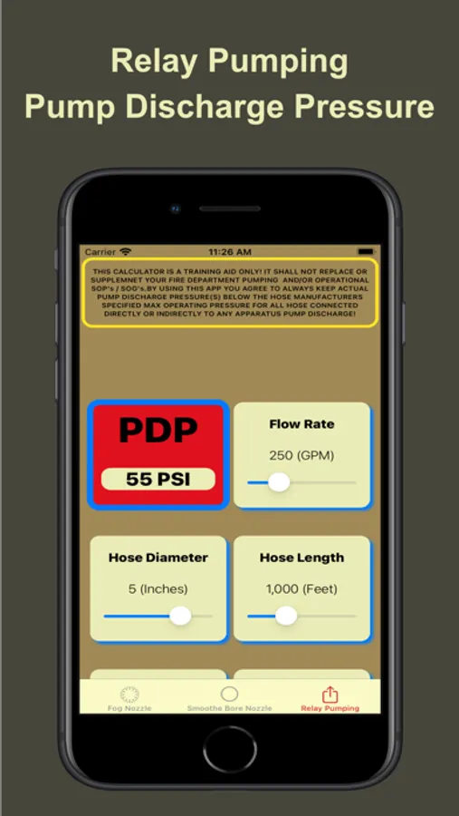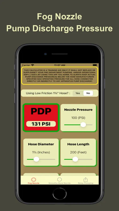 Dedicated screens for Fog Nozzle, SmootheBore Nozzle and Relay Pumping calculations based on flow rate, hose length, hose diameter, nozzle pressure, tip diameter, nozzle elevation. Quickly see the affects of changing any combination or all of these variables on the flow rates and required pump discharge pressures.