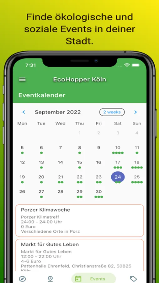 • Veranstaltungskalender: Vielzahl an Events der grünen und sozialen Szene mit stetiger Erweiterung