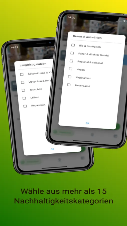 • Filtere aus mehr als 15 Nachhaltigkeitskategorien (Second Hand & Vintage, Upcycling & Recycling, Tauschen, Bio & ökologisch, Fairer & direkter Handel, Regional & saisonal, Vegan, Unverpackt, Umwelt-, Natur- & Tierschutz…)
