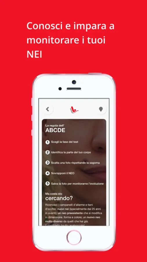Con Skintip impari a proteggerti dal sole con consigli personalizzati sulla tua pelle, fai prevenzione e tieni sott’occhio la cute. Come? Semplice: identifica una parte del tuo corpo, scatta una foto e sovrapponi il neo. Poi salva la foto per monitorare nel tempo.