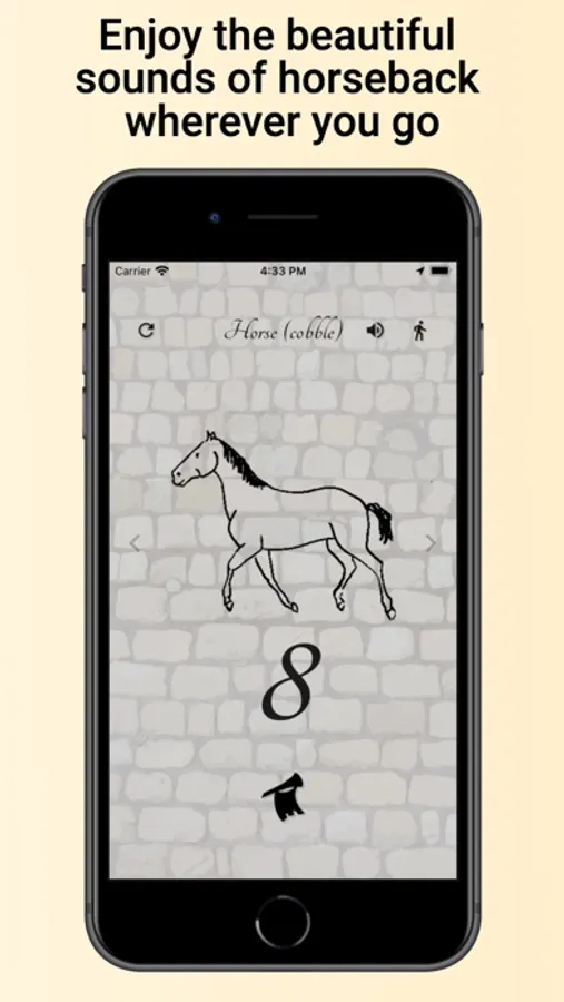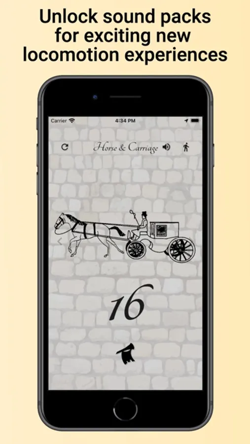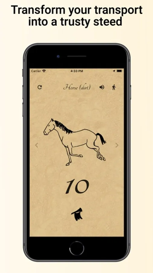 Accompany your travel with the sounds of a horse's hooves striking the ground, matched perfectly to your speed. Includes modes for walking, biking/scootering/skateboaring/etc, and motor vehicles.