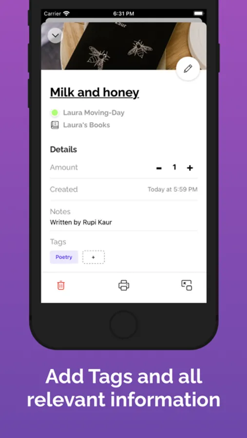 Tags help you to find multiple items which belong to the same category. Take for example different genres of books (e.g. drama, science, thriller etc.). You want to read a book of one of these genres, but you don’t know which? If you have added appropriate Tags to your books, you can just search for your respective category and the app tells you which books might be fitting and where they are stored. You can apply the same principle also for your wine drawer and your DVD collection. There are no limits!