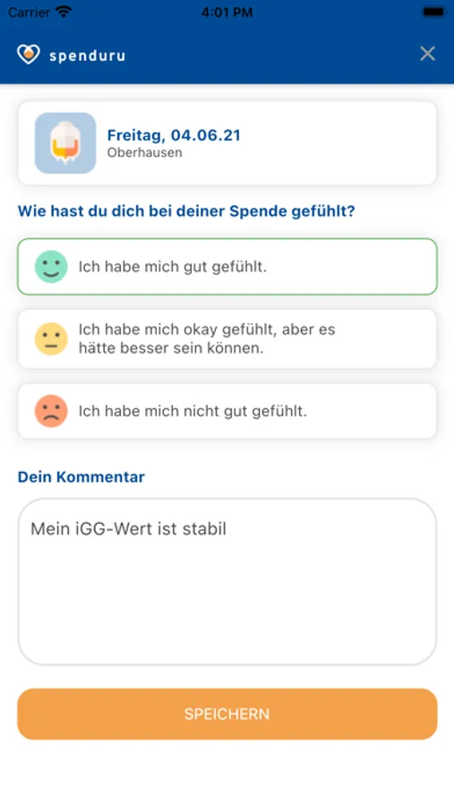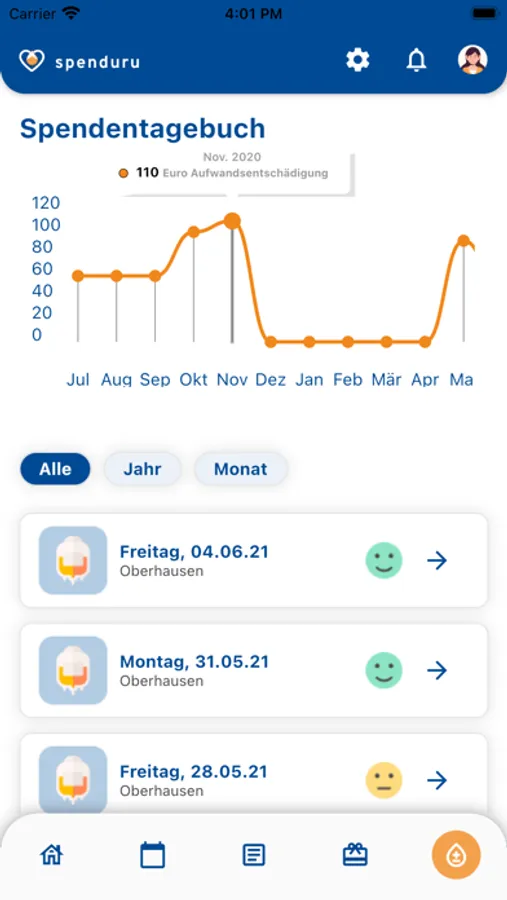 - In deinem Spendentagebuch kannst du deine letzten Spenden bewerten und dir Notizen machen