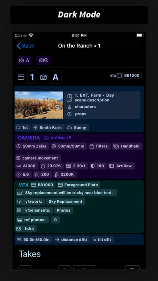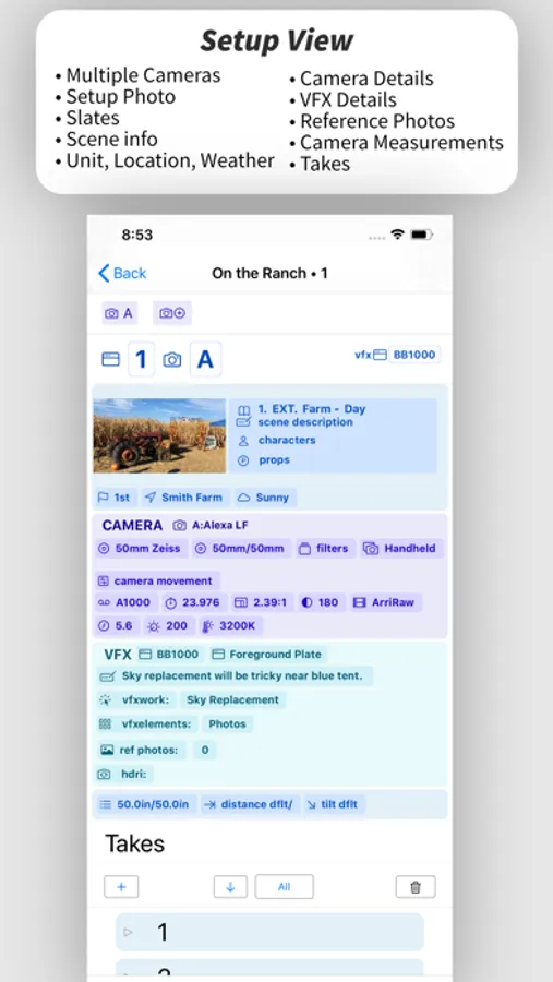 • The app is organized to take notes as filming progresses. Within a PROJECT, you can create a SHOOTDAY, add SETUPS for that day, and add TAKES within that SETUP.