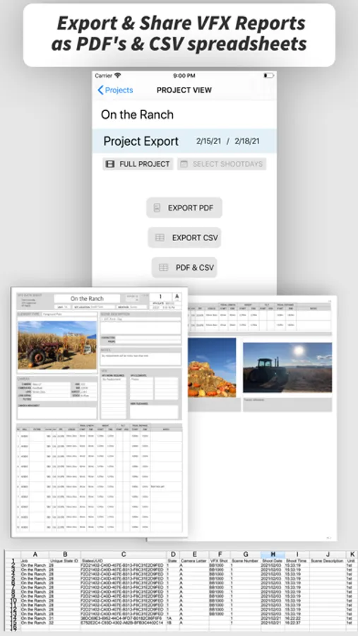 At the end of the shoot day, or the end of the project, you can export an organized PDF report including notes and reference images. You can also export a CSV for importing in VFX data pipelines.