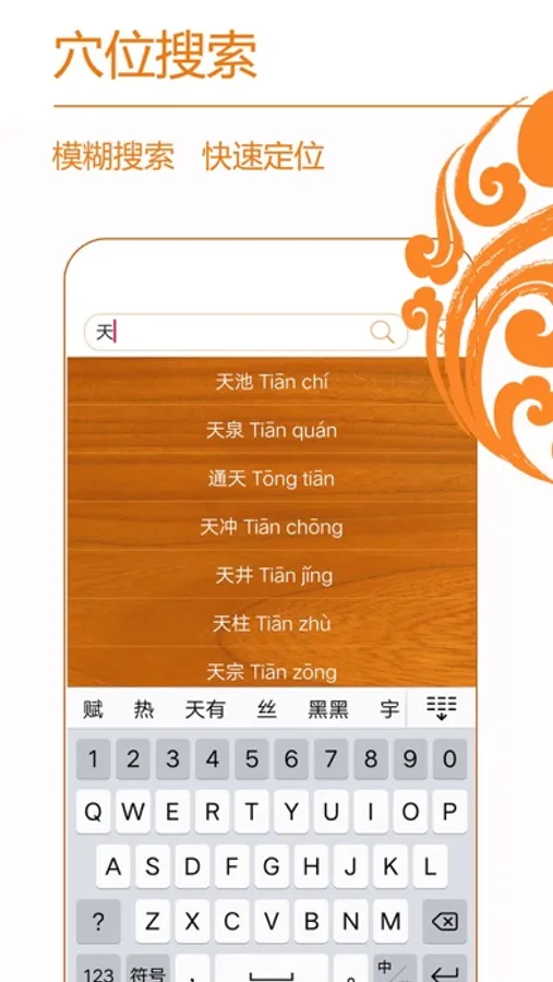 强大的穴位关键词搜索功能,可以根据任意词,快速检索到相应穴位。独有功能。