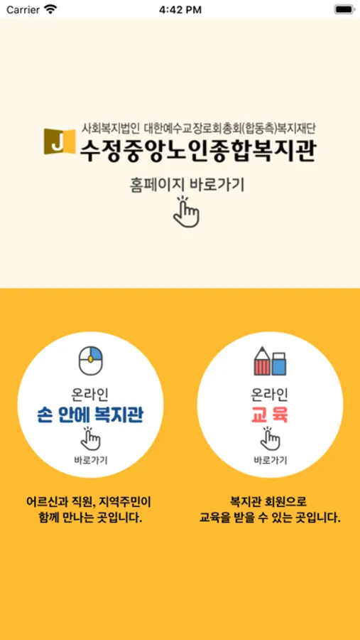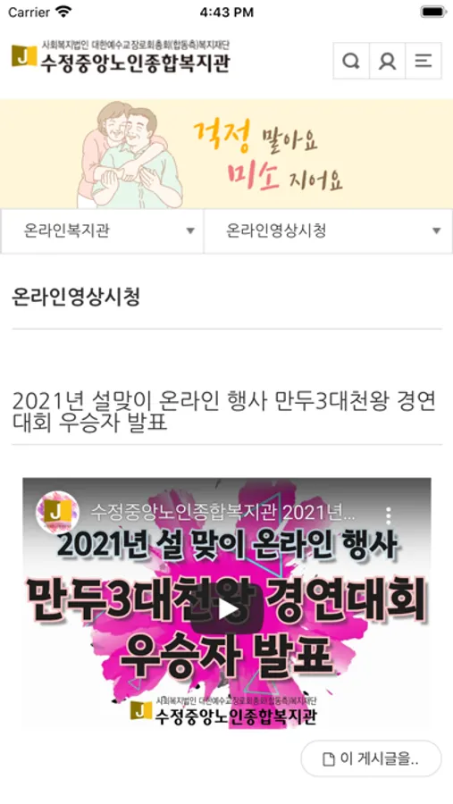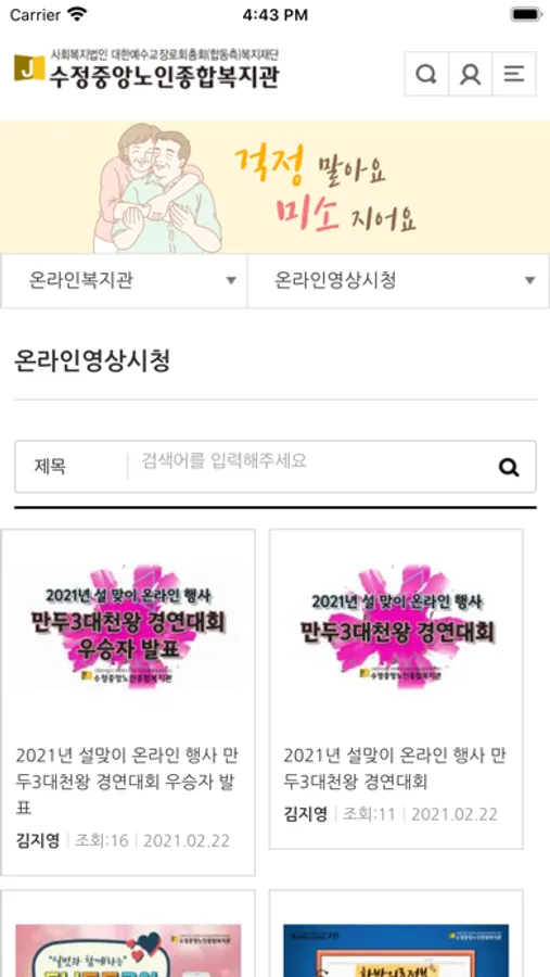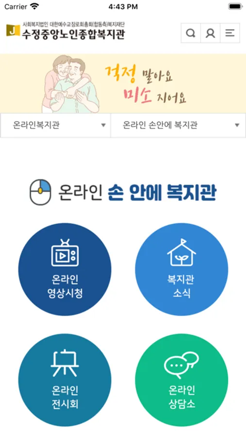 수정중앙노인종합복지관은 지역 어르신들에게 교육, 문화여가, 건강, 일자리 등과 관련된 다양한 복지서비스를 제공하는 기관입니다. 수정중앙노인종합복지관 모바일 어플리케이션은 복지관을 이용하는 지역 어르신들의 정보 접근성을 개선하고자 개발되었습니다.