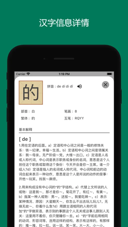 通过简单的汉字卡片等形式来给小朋友进行早教识字学习。同时内置了汉字读音、汉字解释和汉字笔画等功能。