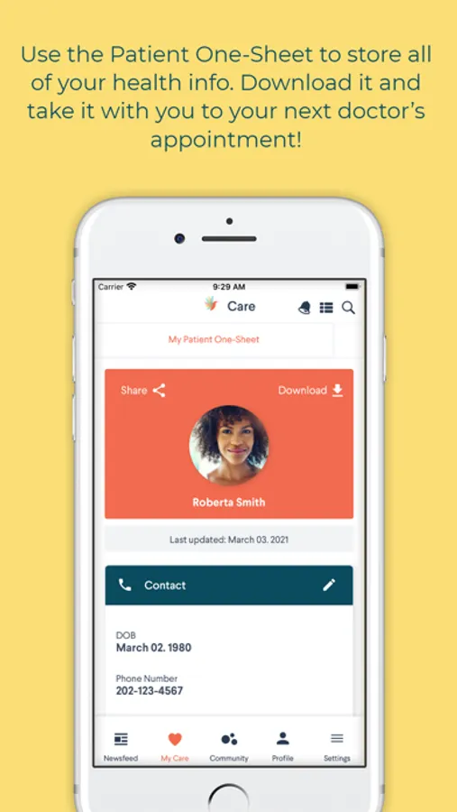 • Keep everything in one place with our Patient One-Sheet, a secure, printable, and shareable form that allows you to easily store and maintain all your basic information – doctors, insurance info, medications, and other key data.