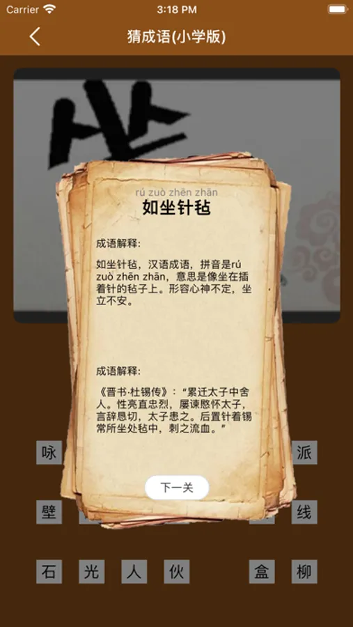 小学常见成语,通过玩游戏,达到记忆效果,同时会给出成语拼音字词解释及成语出处。