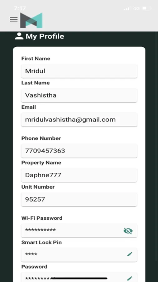 My Profile - Displays your personal information and provides a way to change the SMART Lock's PIN.