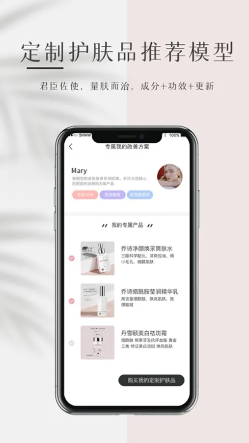 1.人工智能测肤 基于人工智能和光学技术,利用手机拍照、手持测肤仪等软硬件结合采集皮肤数据,利用人工智能算法分析近200+关键指标,全面精准分析皮肤真实状态,基于个性护肤配方算法模型 ,为每一位客户实时定制生成护肤品配方,并提供使用后大数据跟踪、配方改善和个人隐私保护等服务,实现科技与美的完美结合。