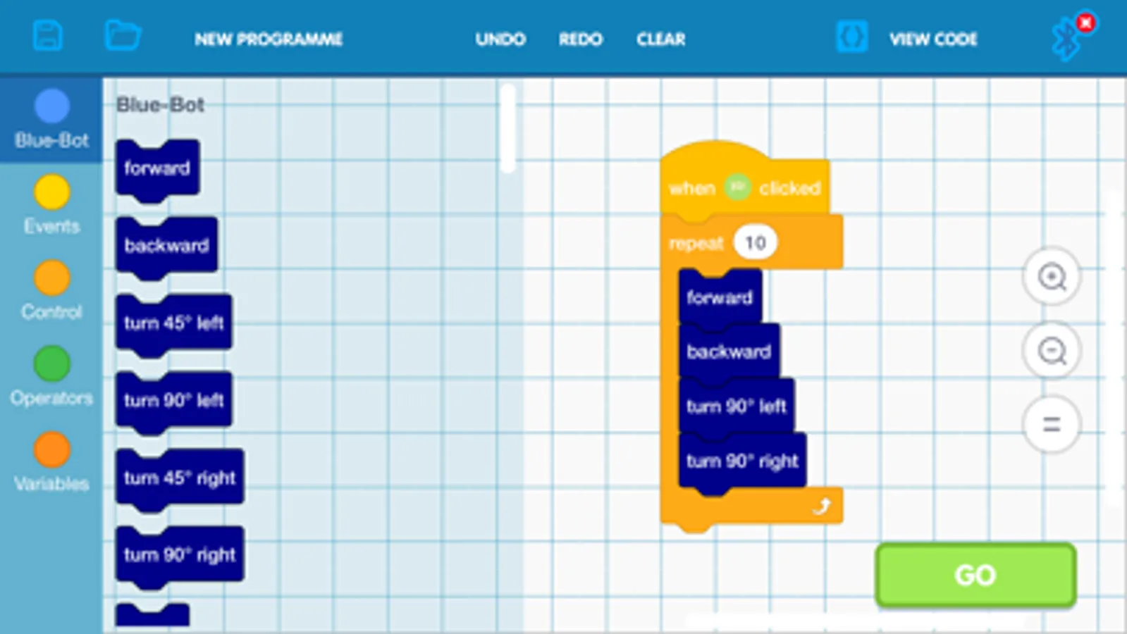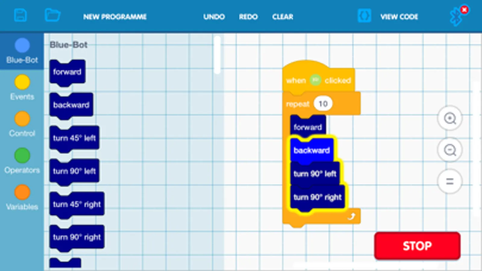 Using a familiar block-based environment, students can programme their Blue-Bot® using extended functionality which includes decision making, numerical functions, Boolean operators, and the introduction of variables.