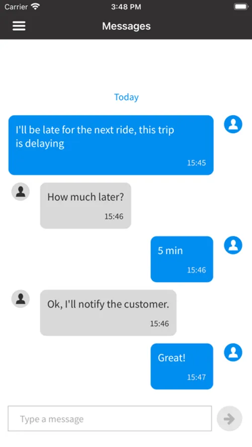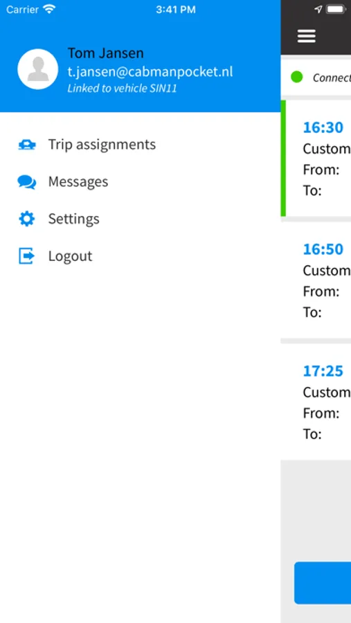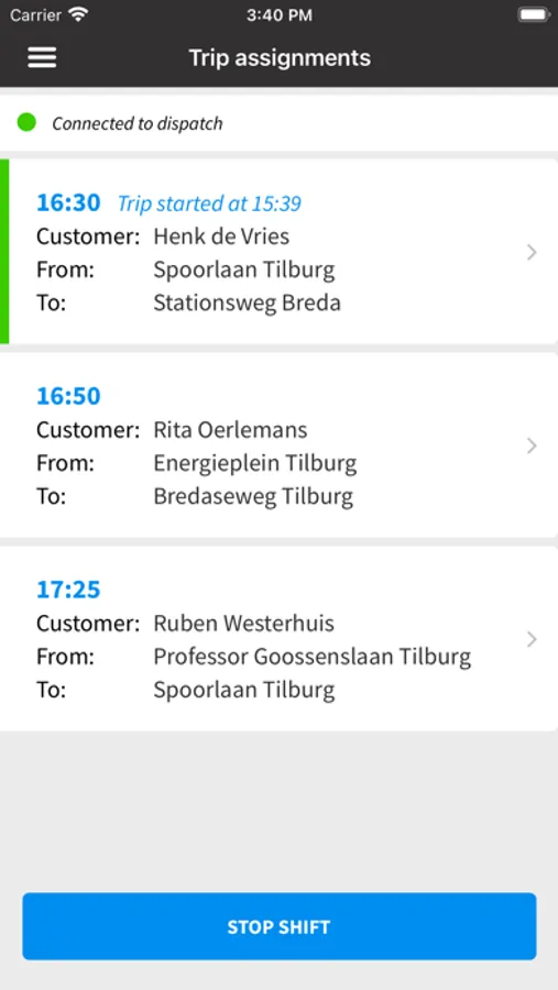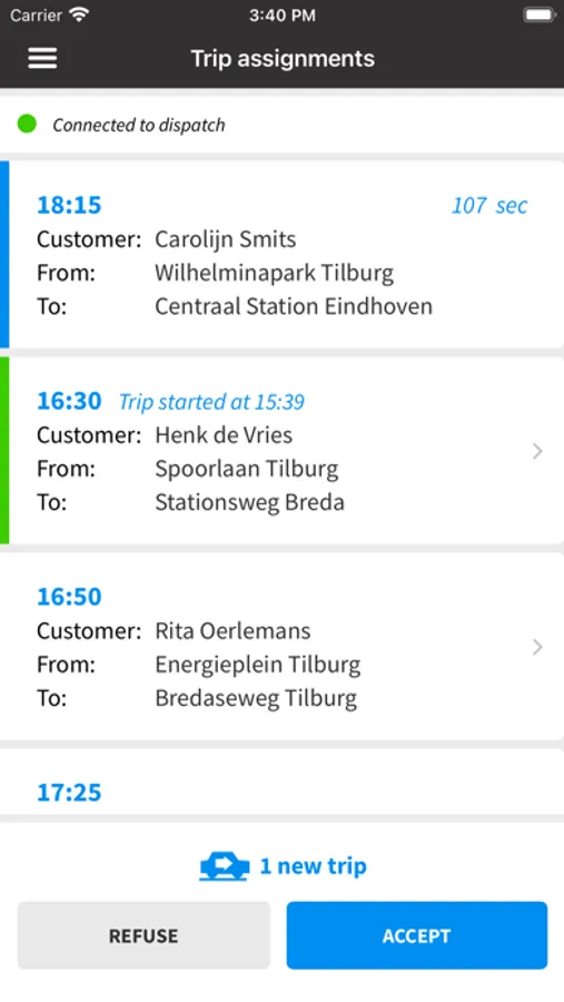 With the app you can accept, refuse and report trips as no show. It is also possible to stop and start trips. In addition, the app offers the option to receive and send messages to the dispatch.