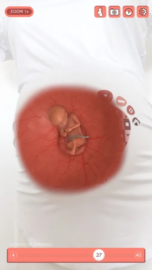 The application is activated with the Welcome baby t-shirt design. It shows an animation of the baby for each week of gestation, on the pregnant woman's belly. With the sensation of observing the development of the fetus, in three dimensions and with a real appearance.