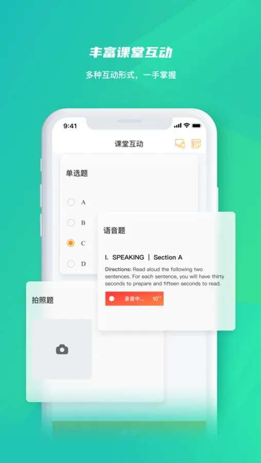 2、课堂互动:教师发起课堂互动,学生通过在屏幕上点击、输入文字、上传图片或录音完成作答。