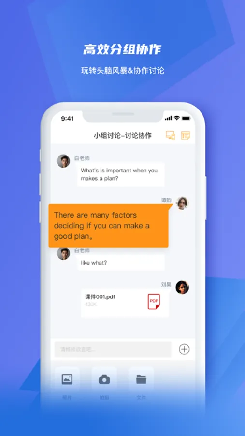 4、主题研讨:参与研讨形式的分组教学,向小组消息流中发送文字、图片和文档,通过基于共享资料的讨论,完善合作成果。