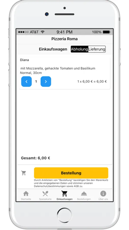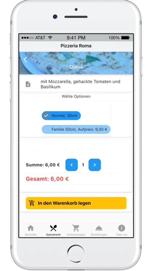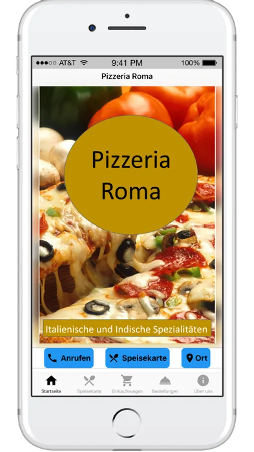 Mit dieser App können alle Gerichte bei Pizzeria Roma bestellt werden.