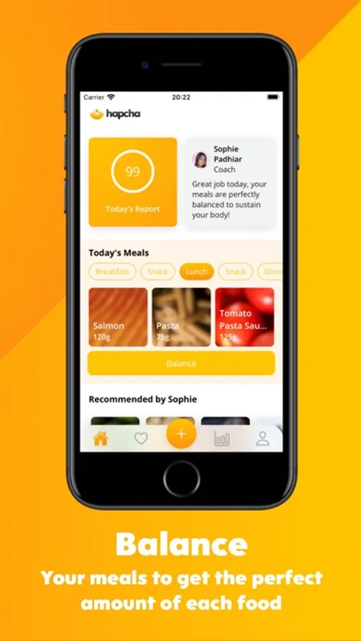 Simply log the foods you eat in the app and your Hapcha coach will suggest small changes you can make to optimise the diet you already have. Then, take it to the next level and tap “Balance”. Hapcha will intelligently scan all the foods you’re eating today and tweak the amount of each so that you can get the nutrition you need from the foods you love.