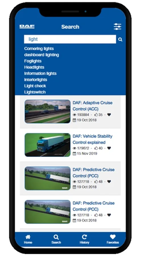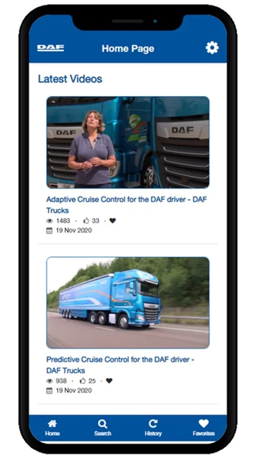 The DAF Video App allows truck drivers and DAF enthusiasts to learn more about our truck range LF, CF, and XF. A large selection of Youtube videos and animations provide hands-on insights into functionalities, safety systems, and driving efficiency. No registration needed, you can just download the app and start watching DAF videos.