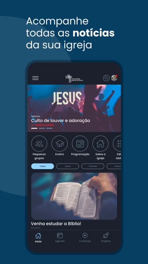 Recursos disponíveis no Aplicativo: Notícias, Agenda da igreja, Eventos, Conteúdos, Projetos, Transmissão ao Vivo e Módulo Ensino.