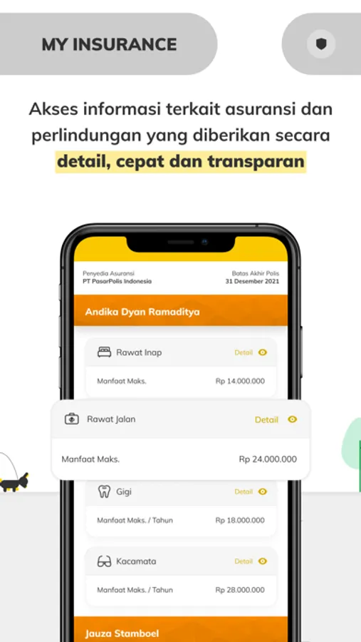 Semua dalam satu aplikasi PasarPolis Employee Benefit! Melalui aplikasi ini, Anda akan bisa melihat manfaat asuransi yang diterima, mengajukan klaim dengan mudah dan cepat, informasi mengenai rekanan rumah sakit mana yang ditanggung oleh asuransi, hingga cek kondisi kesehatan Anda.