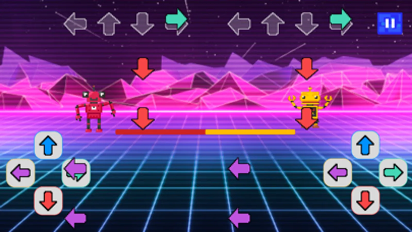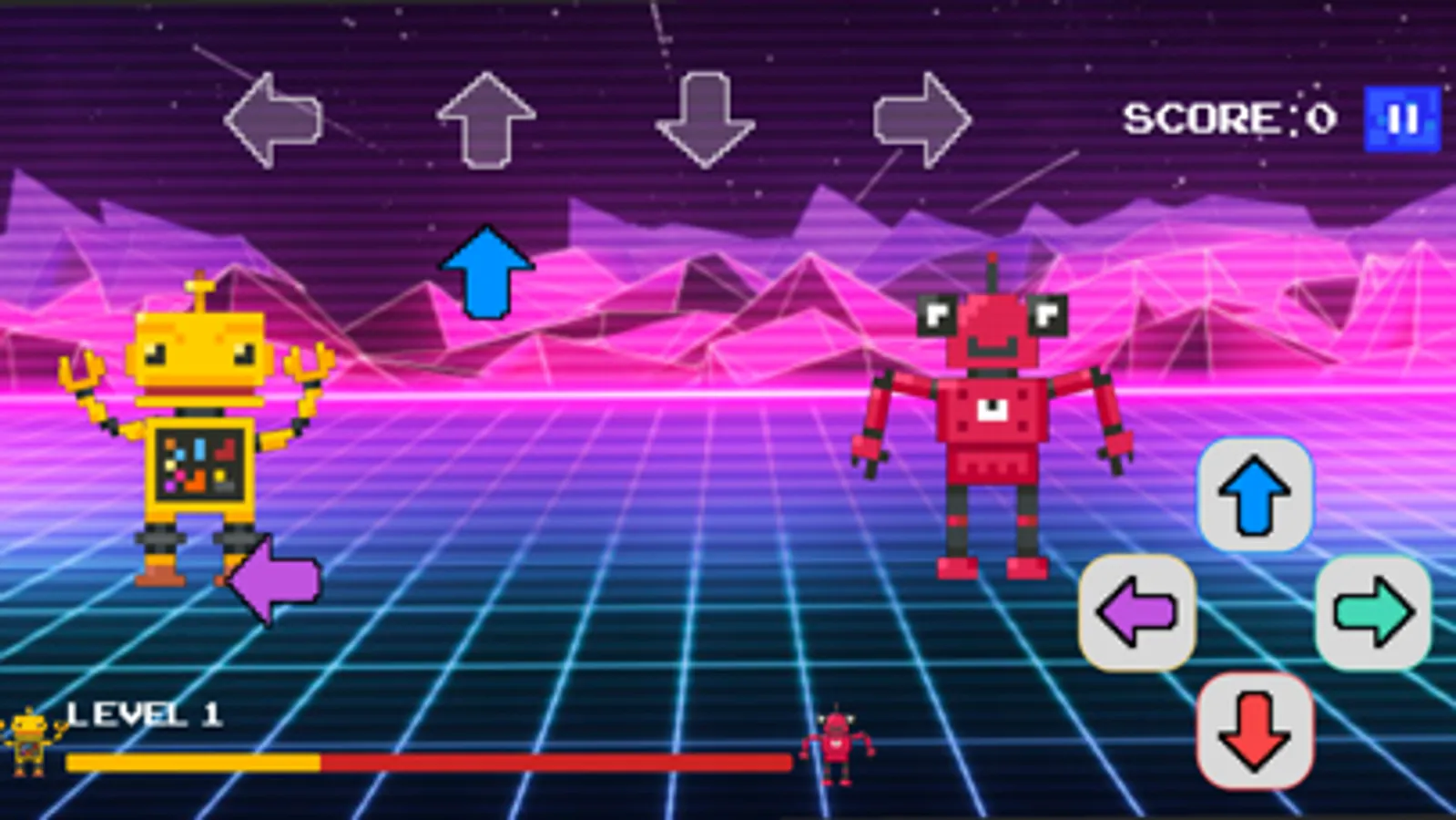 Challenge yourself to fight other robots through tracks. The higher the level, the stronger the robots and the higher the speed of the arrows. How to play just tap the arrow when they exact match.