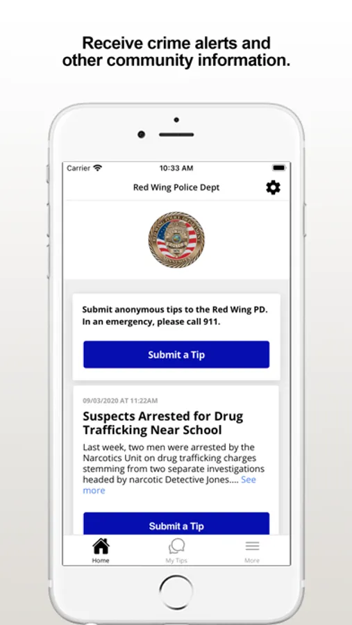 The Red Wing PD app provides citizens the ability to submit anonymous tips to the Red Wing, MN Police Department. The app also displays agency crime alerts and other organization web and social media content.