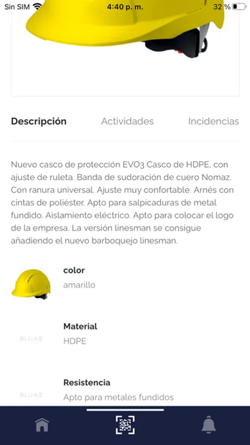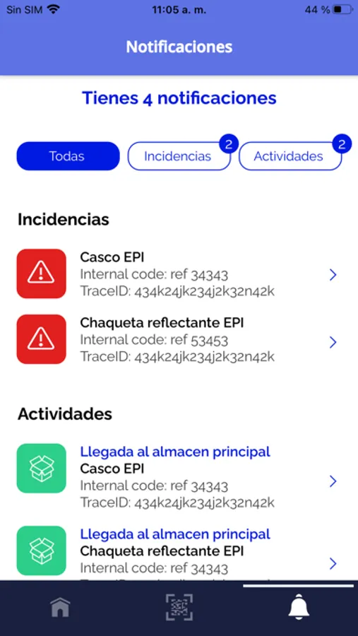 Además del botón central de “escaneo”, el menú de la app posee un botón derecho de “alertas” y un botón izquierdo de “home”. Dentro de alertas accedemos a visualizar todos los últimos eventos registrados sobre el producto, tales como un cambio de estado, cambio de localización, o generación de una nueva incidencia. Dentro de “home”, accedemos a notificaciones relacionadas con el producto, que el usuario sólo recibirá en caso de que desde la ficha de producto esté asociado como “usuario responsable”.