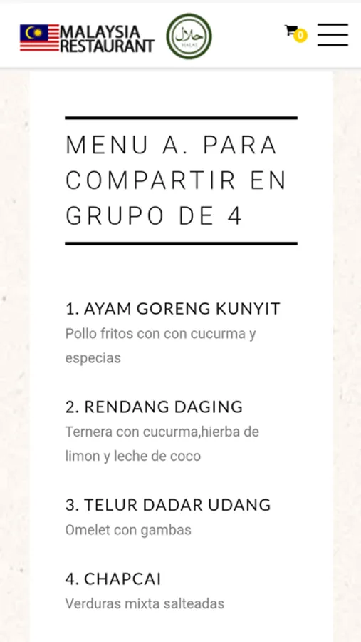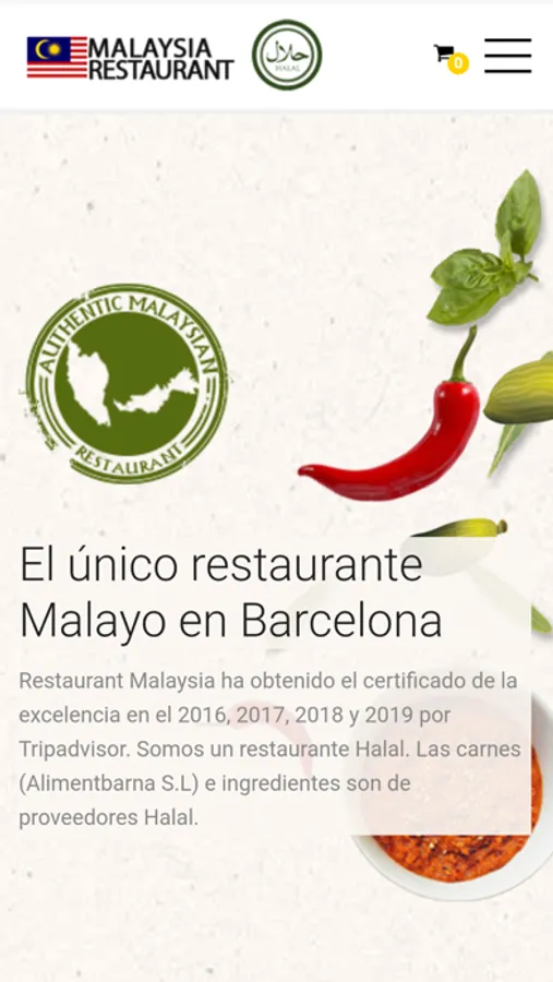 Restaurant Malaysia ha obtenido el certificado de la excelencia en el 2016, 2017, 2018 y 2019 por Tripadvisor. Somos un restaurante Halal. Las carnes (Alimentbarna S.L) e ingredientes son de proveedores Halal.