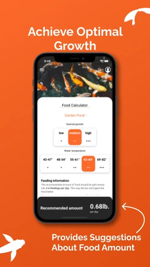 Healthy and strong growth is the desire of every koi keeper. Through our built-in food calculator you can calculate the ideal amount of food. Based on your koi population and the water temperature, the recommended food quantity for your growth ambitions is calculated automatically. You don't even need to know the weight of your fish, as KoiControl determines this very accurately based on the length of the fish.