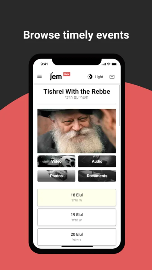 Be uplifted as the Rebbe teaches a plethora of timely topics with practical life lessons; listen in as the Rebbe advises individuals to navigate their challenges – whether in parenting, business or relationships. Join thousands as they are swept up in the notes of a heartfelt Chasidic melody, browse meticulously-restored archival photos, or experience a full-length Farbrengen (Chasidic gathering and public address) with the Rebbe.