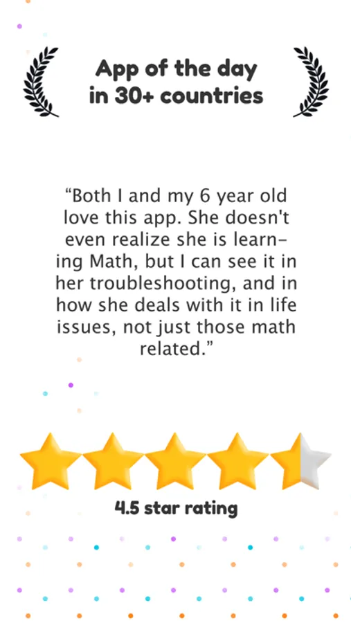 • “Both I and my 6 year old love this app. She doesn't even realize she is learning Math but I can see it and the troubleshooting in how she deals with life issues, not just those math related.” - Mary Guokas