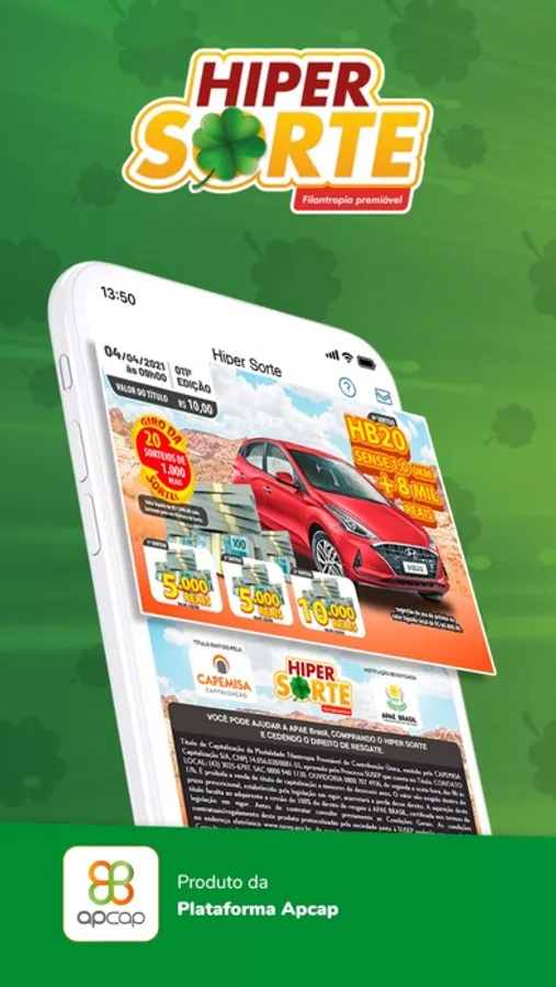 O HIPER SORTE é um Título de Capitalização de Contribuição Única, da Modalidade Filantropia Premiável, com atuação no Paraná, aprovados pela SUSEP e emitidos pela Capemisa Capitalização S/A (CNPJ nº 14.056.028/0001-55). Além de proporcionar o direito de participação em sorteios ao subscritor, com o HIPER SORTE você pode contribuir para o desenvolvimento e custeio da APAE Brasil, através da cessão do direito de resgate do seu Título, gerando recursos que serão investidos na prestação de serviços de assistência nas diversas atividades da instituição. Conheça mais sobre o trabalho e os projetos da APAE Brasil no site: www.apaebrasil.org.br.