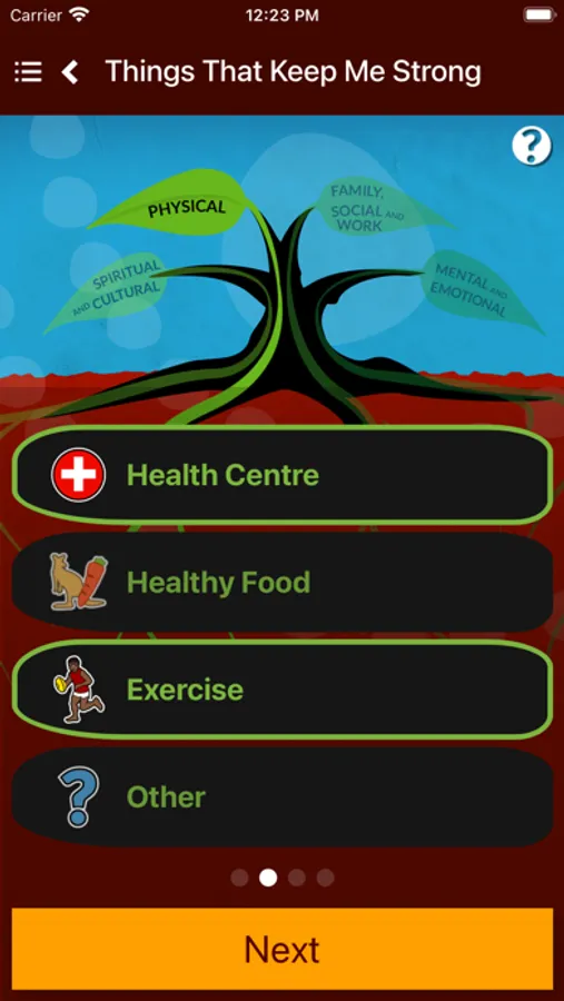 Next, the client discusses things that keep them strong, using the metaphor of a tree. Spiritual, physical, work, family and emotional strengths are explored. As the client selects a strength there is a concurrent growth in the size of the relevant leaf. Strengths can be personalised by adding text.