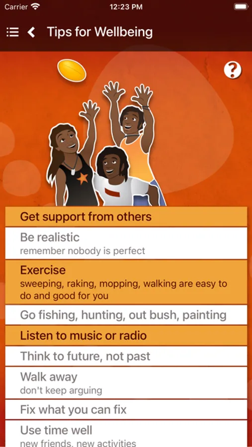 Using the metaphor of a football field, the client is then asked to identify one or two goals for making change. The changes that would be required, reasons for making the change, steps to achieving the goal, people who can help and timeframes are entered. The App also includes tips for making change to reduce substance abuse and improve wellbeing and wellbeing assessments including the Kessler 5 and 10 and now the PHQ-2.