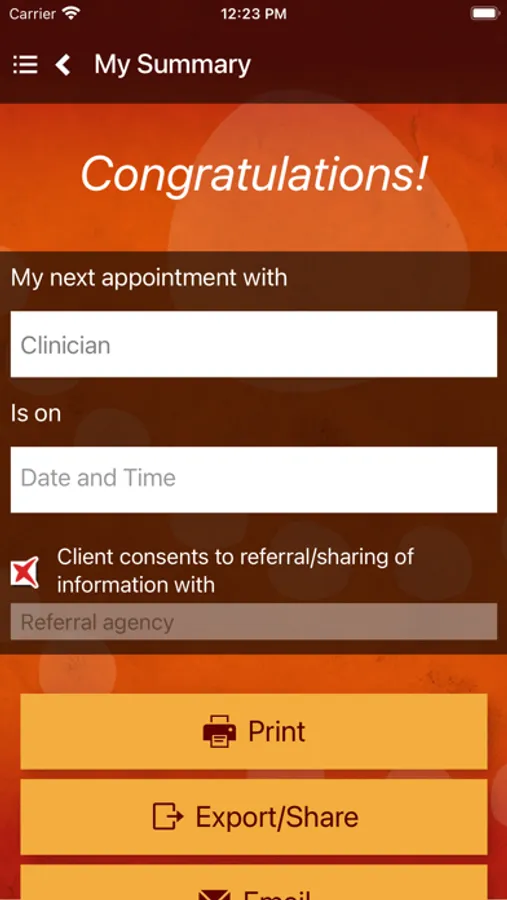 After navigating through all the pages, the client is taken to their Stay Strong Plan where a summary is provided and details of their next appointment can be entered. There is an option of emailing or sharing a text, pictorial or csv summary of the data entered.
